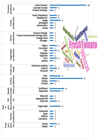 We divided the products into 11 categories: tomato, fruits, citrus, vegetable, fresh salad, grains, seeds, oil, sugar, flower, and trees, as shown in Figure 7. The most common product was tomato; 13 studies analyzed tomato production, including fresh tomato, canned tomato (whole peeled, paste, and diced), and ketchup. The second most common product was wheat with nine studies. Because some studies involved more than one crop, that explains why the same reference was used for multiple crop groups and why the number of studies on the chart exceeds the number of studies covered. Tomato production was separated into three categories since three types of tomato products (fresh tomato, canned tomato, and tomato ketchup) were considered, as indicated in the diagram.