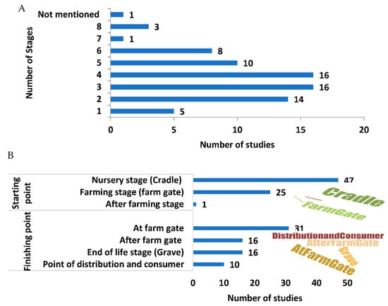 Similarly, the final stage differed from one study to another, ranging from the farming stage to the grave, including the product’s processing, packaging, storing, and transferring stages. Thirty-one studies in the literature review included steps until the crop harvesting stage, whereas 16 authors included some or all of the processing, packaging, and storing stages in the study’s scope. A number of reviewed studies reached the point of distribution and consumption in their analysis. Disposal and waste management were the final stages in some studies, with 10 articles including the end-of-life phase in their analysis (Figure 8B). One study did not specific boundaries; thus, the number in Figure 8B is less than the number of studies reviewed [24].