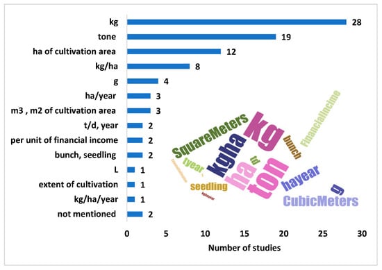 Another step of the goal and scope phase is to choose a functional unit of the scope. A functional unit is the reference unit in which elementary flows from the inventory until the impact assessment stage are represented. Selecting the ideal functional unit is necessary during the boundary designation step. The functional unit is dependent on the type of input materials (raw material) and the final products. Accordingly, the input unit might be separate from the outputs. For example, the output such as GHG emissions could be in kg·ha−1 while the final product could in tons or the input material could be in kWh for energy consumption and kg for fertilizers. Figure 9 shows the most common functional units used in previous studies.