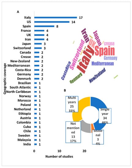 (A) Quantitative (bars) and qualitative (word cloud) representation of the geographic coverage considered in the reviewed studies; (B) donut chart depicting the temporal scales used in the literature.