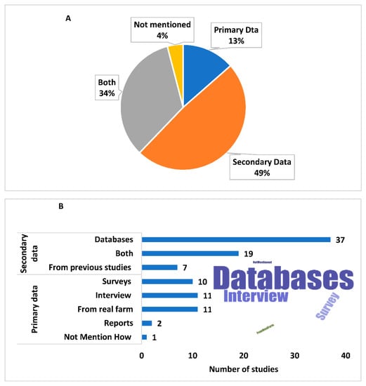 About 48% of the studies used secondary data, 13% used primary data, and 35% used both. One study collected data from a real farm experience. Three authors conducted interviews with owners to collect the data. Two studies used surveys with specific questions to collect the required information. One study mentioned that the source was primary, but the article did not specify their method. Seven studies utilized primary data, while the other nine used secondary data. The authors of the examined research utilized two types of secondary data methods: databases and previous studies. Eleven of the studies used databases, while five of them used previous studies. Five writers, on the other hand, gathered inventory data from databases and prior studies. Twenty-six studies utilized both primary and secondary approaches to reduce the uncertainty of their findings (Figure 12A,B).