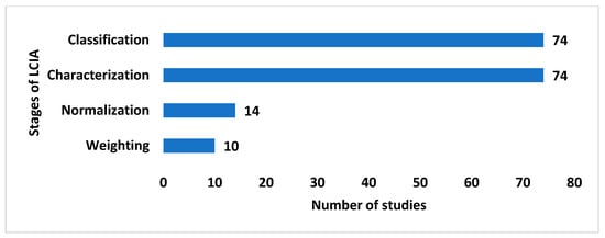 In life cycle impact assessment (LCIA), the significance of a product system’s potential environmental impacts, based on life cycle inventory results, is evaluated using LCIA. The LCIA consists of several elements: classification, characterization, normalization, and weighting. Of these four elements, normalization and weighting are considered optional, while the first two are mandatory elements in LCIA [10] (Figure 13). As shown in Figure 14, all 74 reviewed studies completed the classification and characterization phases, whereas 14 studies completed normalization and 10 completed weighting. Few studies included the waiting stage since it is optional and challenging.