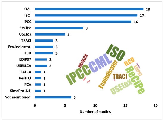 The first step is classification, which involves identifying the impact assessment method. The most common standard method was the CML with various versions, such as CML 2 baseline 2000 V2/world, developed by the Center for Environmental Studies, and CML 2000 produced by the Center of Environmental Science of Leiden University. The second most common methods were ISO 14044 (2006), ISO (2000), and ISO 14040, followed by many other methods, such as IPCC 2001 GWP 100, proposed by the Intergovernmental Panel on Climate Change. For more information about the methods used in the studies, see Figure 15. The model used to calculate the impact is determined by the impact category the author intends to examine. As a result, LCA, ISO, and IPCC were the most commonly used impact methods since they provide categorization factors for ecotoxicity and climate change, which were among the criteria used to select articles for this review.