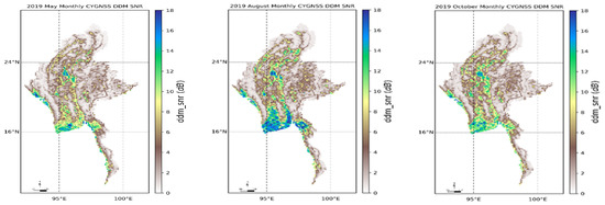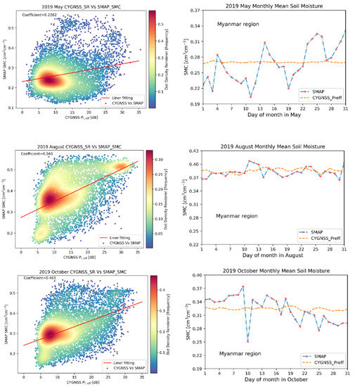 | Observed Date (2019) (Monthly) | DDM SNR vs. SMAP SM (Coefficient Value) | Surface Reflectivity vs. SMAP SM (Coefficient Value) |