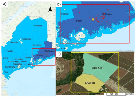 Location of the study sites: (a) a map of the state of Maine (light blue color), USA showing the location of the major wild blueberry production region (Washington and Hancock County) in dark blue color; (b) a map of the major wild blueberry production region in Maine showing 89 wild blueberry fields in red polygons for this study with an area of 0.06 km2 (250 m × 250 m) or larger; (c) Airport and Baxter wild blueberry fields of Wyman’s in Deblois, Washington County, ME, USA.