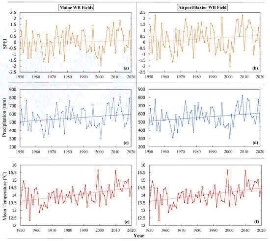 Historical (1950 to 2020) patterns of the (a,b) SPEI_6 of September; (c,d) mean precipitation (average of May–September); (e,f) average temperature (average of May–September) throughout the major wild blueberry production region in Maine as well as at the Airport/Baxter wild blueberry fields in Deblois, ME. A positive SPEI value represents wet conditions, while a negative SPEI value indicates dry conditions. Here, mean precipitation refers to an average of the monthly total precipitation (mm), and mean temperature refers to an average of the monthly air temperature at 2 m from the surface for the growing season.