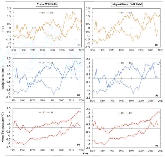 Sequential Mann–Kendall test statistics (UF and UB values) calculated from the (a,b) SPEI_6 of September; (c,d) mean precipitation (average of May–September); (e,f) average air temperature (average of May–September) throughout the major wild blueberry production region in Maine, as well as at the Airport/Baxter wild blueberry fields in Deblois, ME. Here, the upward UF curve (forward trend) mostly being > 0.0, UB (backward trend) curve mostly being < 0.0, and UF and UB not intersecting with each other indicate the significant increasing trends of the mean temperature. The intersections of the curves with the 0.0 line as well as with each other represent the non-significant changing (increasing/decreasing) trends of the SPEI and precipitation.