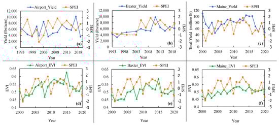 (a,d) Historical values of yield and SPEI ((a): 1993–2019), and of the EVI and SPEI ((d): 2000–2020) for the Airport (irrigated) field, Deblois, ME. (b,e) Historical values of yield and SPEI ((b): 1993–2019), and in the EVI and SPEI ((e): 2000–2020) for the Baxter (non-irrigated) field, Deblois, ME. (c,f) Historical values of yield and SPEI ((c): 2000–2020), and in the EVI and SPEI ((f): 2000–2020) for the major wild blueberry production region in Maine. Here, orange dashed lines indicate SPEI, blue solid lines indicate yield, green solid lines indicate EVI. Here, SPEI refers to SPEI_6 of September. It represents the SPEI of the growing season (April–September) and indicates water conditions. A positive SPEI value represents wet conditions, while a negative SPEI value indicates dry conditions.