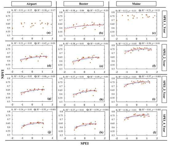 Average normalized difference vegetation index (NDVI) of wild blueberry fields during the growing season (May to September) for three different study zones: Airport (irrigated), Baxter (non-irrigated), and the major wild blueberry production region in Maine in relation to (a–c) SPEI_1_Year; (d–f) SPEI_2_Years (average SPEI of two consecutive years); (g–i) SPEI_3_Years (average SPEI of three consecutive years); (j–l) SPEI_4_Years (average SPEI of four consecutive years). Here, SPEI refers to SPEI_6 of September and it represents the SPEI (water conditions) of the growing season (April–September). A positive SPEI value represents wet conditions, whereas a negative SPEI value indicates dry conditions. The blue solid lines indicate significant (p < 0.05) and blue dashed lines indicate marginally significant (p < 0.10) linear relationships. The dashed red lines indicate significant (p < 0.05) or marginally significant (p < 0.10) quadratic relationships. The time period of the EVI and SPEI data was from 2000 to 2020.