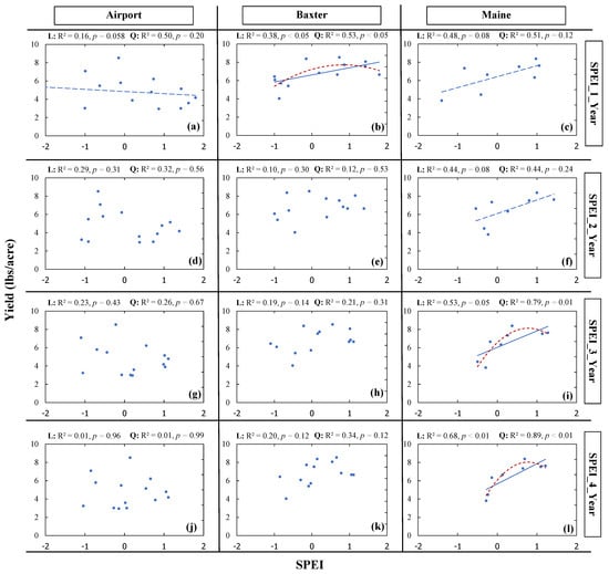 Average yield (lbs./acre) in a year for three different study zones: Airport, Baxter, and the major wild blueberry production region in Maine in relation to (a–c) SPEI_1_Year; (d–f) SPEI_2_Years (average SPEI of two consecutive years); (g–i) SPEI_3_Years (average SPEI of three consecutive years); (j–l) SPEI_4_Years (average of SPEI of four consecutive years). The SPEI data represent SPEI_6 of September. Here, SPEI refers to SPEI_6 of September and it represents the SPEI (water conditions) of the growing season (April–September). A positive SPEI value represents wet conditions, while a negative SPEI value indicates dry conditions. The numbers mentioned in the Y-axis were shortened by dividing the yield (lbs./acre) by 1000. The blue solid lines indicate significant (p < 0.05) and blue dashed lines indicate marginally significant (p < 0.10) linear relationships. The dashed red lines indicate significant (p < 0.05) or marginally significant (p < 0.10) quadratic relationships. The time period of the EVI and SPEI data was from 2000 to 2020.