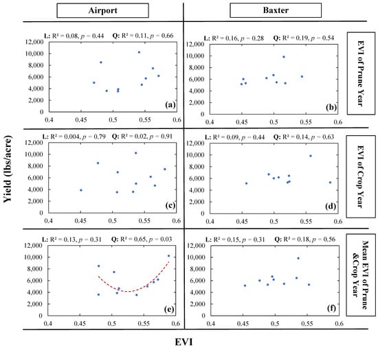 Relationship between wild blueberry yield (lbs./acre) and the average enhanced vegetation index (EVI) of (a,b) the prune year, (c,d) the crop year, and (e,f) the average of the prune and crop year from the Airport (irrigated) and Baxter (non-irrigated) fields in Deblois, Maine. The dashed red lines indicate significant (p < 0.05) or marginally significant (p < 0.10) quadratic relationships.