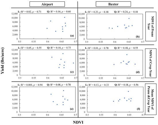 Relationship between wild blueberry yield (lbs./acre) and the average normalized difference vegetation index (NDVI) of (a,b) the prune year, (c,d) the crop year, and (e,f) the average of the prune and crop year from the Airport (irrigated) and Baxter (non-irrigated) fields in Deblois, Maine.