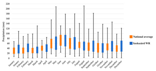 As it was stated above, detailed data concerning meteorological patterns of Szekszárd over the last 40 years were available. The precipitation variability between 1977 and 2018 regarding both SZWR and the national average is presented in Figure 4. Based on the available data, it can be stated that the amount of precipitation has a significant variability over the last 40 years in SZWR: In the case of May and August, the maximum amount of precipitation exceeded 200 mm (in 2010 and 2005, respectively). However, the minimum amount in these months was 8.5 mm in 1993 and 3 mm in 1992, respectively. Minimum values are under 10 mm every month, consequently, arid periods were observed from 1977. Comparing the dataset of SZWR and the national average, it is worth emphasizing that the variability of precipitation data regarding the study area exceeds the national average in the case of all months in the last four decades. Consequently, winemakers may be facing weather extremes in the future, which considerably increases the uncertainties concerning yield, wine quality, and profitability.