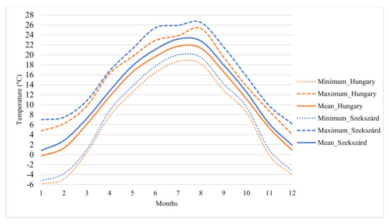 Ranges between the minimum and maximum values of temperature data (Figure 6) are narrower than in the case of the above-mentioned precipitation patterns in both national and SZWR data. From May to August, the average temperature was above 20 °C, which is crucial and ideal for red varieties. However, maximum values above 25 °C profoundly endanger optimal maturity and ripening, while also concerning social aspects, as outdoor labor in vineyards. Months with minimum values below 0 are rare, frosty days are observed mainly in January, February, and December. However, according to regional climate models [101], these days are projected to disappear by the end of the 21st century in SZWR. According to the available climatic dataset, it is not surprising that red varieties are dominant in the studied area. However, further warming trends can modify the most popular varieties based on the suitability of the current cultivated area.