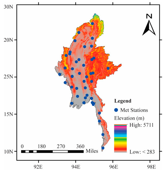 - Zin, E.E.; Aung, L.L.; Zin, E.E.; Theingi, P.; Elvera, N.; Aung, P.P.; Han, T.T.; Oo, Y.; Skaland, R.G. Myanmar Climate Report. Norwgian Meterological Inst. 2017, 105. [Google Scholar]