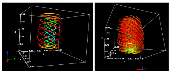 The normalised three-dimensional stream lines of the vortex velocity field. On the left panel only four stream lines are shown. The light blue and green colours of the stream lines correspond to the internal structure of the vortex. The red and amber colours correspond to the external part of the vortex. On the right panel more than forty velocity stream lines are shown. The red, green and blue orthogonal vectors colours indicate the x, y and z axis, correspondingly. The visualisation was computed for and .