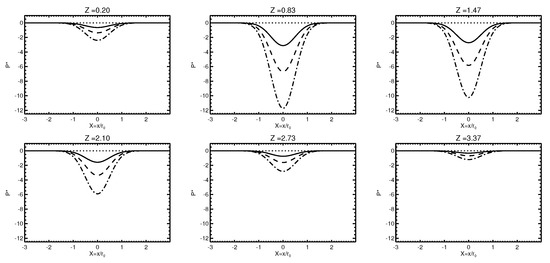 The behaviour of the normalised pressure across the vortex at different heights for the values of equal to 9.34, 14.0 and 18.7 (solid, dash and dash-dot plots, correspondingly).