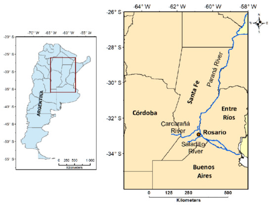 The Paraná River, which drains the second largest basin (2,600,000 km2) in South America, flows across the Humid Pampa. The city of Rosario is located in the southeast of Santa Fe, on the right margin of the Paraná River, i.e., the core crop region of the Humid Pampa (see Figure 1). Rosario rests over a complex floodplain extending 600 km in the heart of the inland lowlands of the continent [22]. Tributaries to the Paraná River in the area of Rosario are the Carcarañá and the Saladillo Rivers (see Figure 1). Rosario has a privileged location both from the geographic and environmental perspectives. It is the most important city in the core crop region and one of the most important in Argentina, as it is a major industrial, trade, and financial center [23], with 43% of the province population. It is also the main agro-industrial and port hub in the region, and in recent years, it became the largest soybean and by-product export node in the world, with 78% of Argentina’s installed capacity [24]. The port of Rosario is connected to the north with Mercosur countries through the Parana–Paraguay waterway, which is the primary communication corridor with southern Brazil and Paraguay [25].