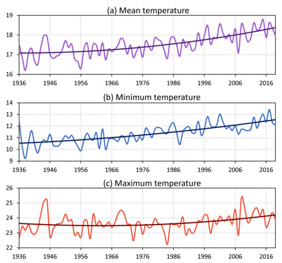 Figure 2 shows the annual averages of the mean, maximum, and minimum temperatures at Rosario Aero station in the 1936–2019 period, together with their significant nonlinear long-term trend. A slight increase is observed in the mean temperature (Figure 2a) in the first decades of the 20th century. This warming reached 1 °C from the 1970s to present, from an average value of 17.3 to 18.3 °C. Annual average minimum temperature (Figure 2b) showed a sustained rise throughout the period, although it was more marked in recent decades, reaching a warming of 2 °C (from 10.5 to 12.5 °C). Annual average maximum temperature (Figure 2c) decreased very slightly from the beginning of the analyzed period to the end of the 1970s; but from then on, it progressively increased by about 0.5 °C. Our results suggest that the minimum temperature recorded a fourfold increase compared to maximum temperature. Consistently, minimum temperature increased globally at rates more pronounced than maximum temperature (e.g., [1,36]).