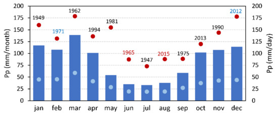 Figure 3 presents the annual cycle of monthly precipitation as well as the average and maximum values of monthly maximum 1-day precipitation (RX1day) at Rosario Aero station in the 1911–2019 period. The annual cycle of precipitation displays significant intra-annual variability. According to Doyle [44], Rosario has a precipitation regime with a short period of low precipitation in winter and fairly uniform precipitation in the rainiest months. Figure 3 shows that the rainy season runs from October to April, when it rains 78% of the annual average. The main forcing factors during the rainy season include the South American Low-Level Jet (SALLJ) east of the Andes [45,46] and the Mesoscale Convective Systems (MCSs). The SALLJ is a key factor that activates convection and favors precipitation in the subtropical plains of South America [47]. MCSs are frequent and account for a large percentage of total precipitation during the warm rainy season (October–April) over northeastern Argentina [48]. March is the rainiest month, with an RX1day average of 59 mm (Figure 3, light blue dot) and an absolute maximum of 179 mm—the same as the maximum RX1day for December (Figure 3, red dots). Summer months (DJF) exhibit precipitation values close to 110 mm/month and average RX1day of near 43 mm along the study period (Figure 3, light blue dots). Winter months (JJA) registered monthly values of 30 mm and an average RX1day of nearly 19 mm. Low winter precipitation is a common feature throughout the region [13,44]. In this season, the northward displacement of the South Atlantic anticyclone restricts water vapor inflow over the south-central region of the continent, which, added to lower solar radiation, results in the weakening of convective processes and heavy rains [49,50].