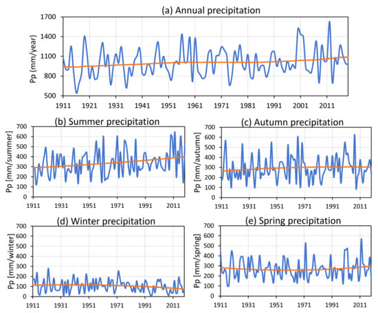 (a) Annual precipitation (mm/year) and (b–e) seasonal precipitation (mm/season) at Rosario Aero station in the 1911–2019 period. Nonlinear trends detected with the SSA method in orange.