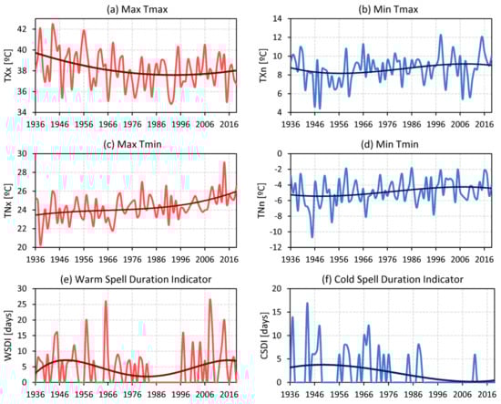 Figure 6a–d presents the changes in intensity of temperature extremes. Figure 6a,b show the temporal evolution of the highest and lowest annual temperatures in the time series of maximum temperature. Figure 6c,d show the same for minimum temperature. The annual warmest maximum daily temperature (TXx, Figure 6a) showed a decrease from the beginning of the period until the 1980s, when it began a slight increase that continues to the present. From end to end, maximum annual temperature decreased by 2 °C throughout the analyzed period. The coldest maximum daily temperatures (TXn, Figure 6b) showed a minor oscillation with no resulting change throughout the study period. On the other hand, the warmest minimum daily temperature (TNx, Figure 6c) presented a sustained increase of over 2 °C that accelerated in the last decades. Finally, the coldest minimum daily temperature (TNn, Figure 6d) exhibited a slight increase of almost 1 °C. The range of warmest daily temperatures (Figure 6a,c) decreases from 16 °C in 1936 to 12 °C in 2016; but the amplitude of the coldest daily temperatures remains basically unchanged around 14 °C throughout the whole period (Figure 6b,d).