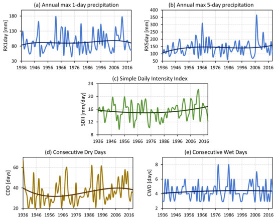 Intensity and duration of precipitation extremes at Rosario Aero station in the 1936–2019 period. Intensity is characterized by: (a) annual maximum 1-day precipitation (RX1day), (b) annual maximum 5-consecutive-day precipitation (RX5day), and (c) simple daily intensity index (SDII). Duration is represented by (d) consecutive dry days (CDD) and (e) consecutive wet days (CWD). See Table 1 for index definition. All nonlinear trends detected with the SSA method are significant at the 95% confidence level.