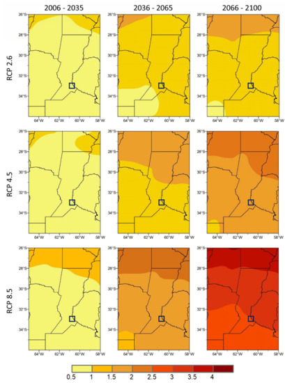 Future climate scenarios were estimated from a subset of GCMs selected in Lovino et al. [39]. Model projections indicated that temperature would continue to rise in central-northeastern Argentina during the 21st century. The growth rate is higher towards the north of the region and decreases towards the south. The warming would not exceed 1 °C in the first period analyzed (2006–2035), regardless of the scenario. From 2035, temperature would be expected to rise, reaching 2 °C at the end of the 21st century under the stabilization scenario. In the high-emission scenario, the rate of increase grows, with temperature changes reaching 3–3.5 °C.