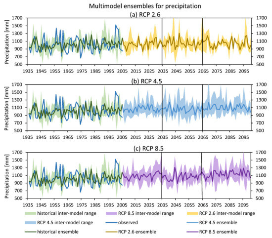 Future climate projections for temperature and precipitation were analyzed using GCM models (Table A1) and their multi-model ensembles, for different time horizons in each of the RCP2.6, RCP4.5, and RCP8.5 scenarios.