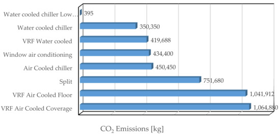 The numerical data for the GWP was taken from the IPCC AR-04 [8], while the refrigerant charge data was used as recommended by the manufacturers, specifically for systems with the largest refrigerant piping. All VRF systems were compared using LATS Heating, Ventilation, and Air Conditioning (HVAC) software. The result of a decreasing value of CO2 emissions by the system is shown in Table 1 and shown in Figure 1 [13,14,15].