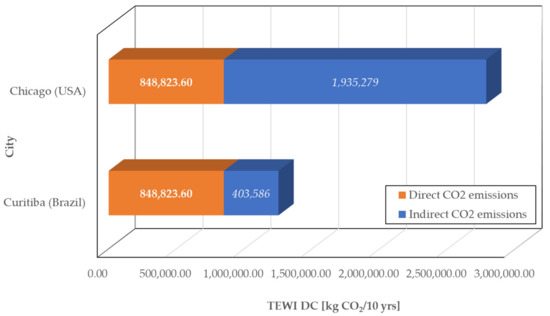 Comparison of TEWI DC (direct and indirect CO2 emissions) of a DC installed in Chicago and Curitiba.