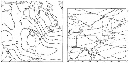 From Figure 4 of [25] showing the typical synoptic scale patterns conducive to LES formation. Left shows sea level pressure (mb) and right shows 850-mb height (m, solid) and 850-mb temperature (°C, dashed).