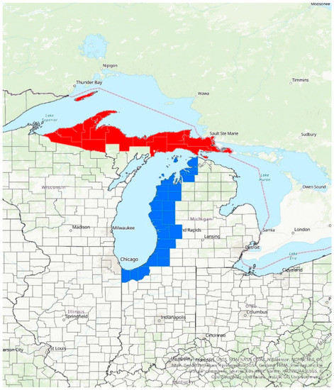 Counties used to identify LES cases from the NOAA Storm Events Database. Counties highlighted in blue were used for identifying Lake Michigan cases and the red counties were used for the Lake Superior cases.