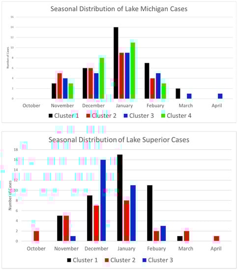 Seasonal distribution of LES cases among different clusters for Lake Michigan (top) and Lake Superior (bottom).
