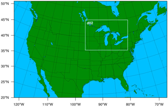 Domain configuration for the WRF-ARW simulations. Spatial resolutions for the parent domain and the nested domain (d02) were 12 and 4 km, respectively.