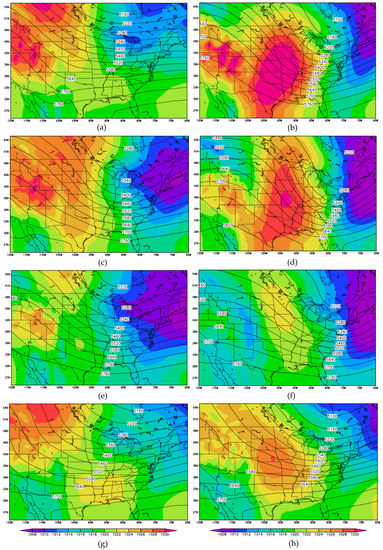 Lake Michigan 500 mb geopotential height (contours; m) and mean sea-level pressure (MSLP) (shaded; mb) composites at t = 0 h for Cluster 1 (a), Cluster 2 (c), Cluster 3 (e), and Cluster 4 (g) and t = 42 h for Cluster 1 (b), Cluster 2 (d), Cluster 3 (f), and Cluster 4 (h).