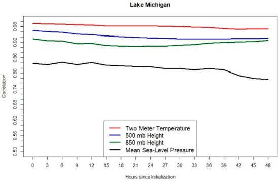 When assessing the primary differences among the Lake Michigan composites, several key outcomes were revealed. To quantify these differences, average Pearson correlations for all possible pairwise combinations of clusters (e.g., cluster 1 and 2, cluster 1 and 3, etc.) for each considered composite field (MSLP, 500 mb height, 850 mb height, and 2-m temperature) were computed at all 17 analysis times. These results quantified (Figure 9) quantified the degree of global similarities in time for each of the presented fields. In general, the results for Lake Michigan showed two primary spatial structures from within the larger group of 4 clusters, as the average correlation between Clusters 1 and 4 (r = 0.82) and Clusters 2 and 3 (r = 0.94) were maximized with these pairs. We discuss differences among these paired patterns below.
