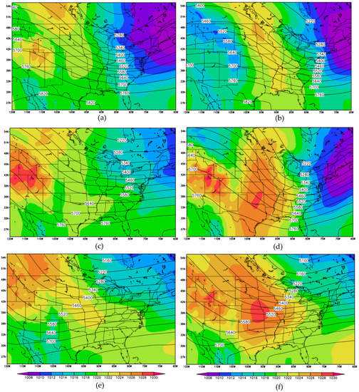 Lake Superior 500 mb geopotential height (contours; m) and mean sea-level pressure (MSLP) (shaded; mb) composites at t = 0 h for Cluster 1 (a), Cluster 2 (c), and Cluster 3 (e) and t = 42 h for Cluster 1 (b), Cluster 2 (d), and Cluster 3 (f).