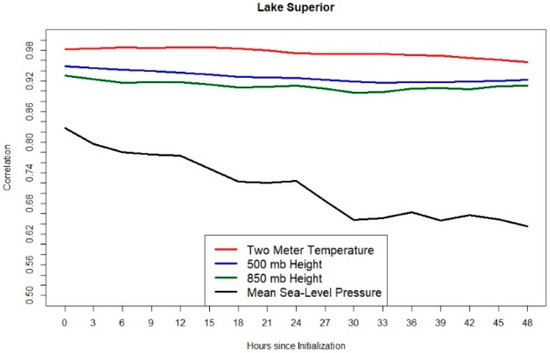 After the same average correlation analysis done for Lake Michigan was conducted on the Lake Superior composites, the results once again revealed that surface patterns were the primary differences among the clusters (Figure 12). This was most apparent in the MSLP fields as the average correlations decreased dramatically over time with the MSLP (0.83 at t = 0 h versus 0.64 at t = 48 h). The structure of the surface pressure dipole, upper-level fields, and surface wind fields were most similar between Clusters 1 and 2 (r = 0.77), as both had a zonally oriented surface pressure gradient across Lake Superior that resulted in primarily northerly winds. The main differences in these clusters’ surface characteristics were the position and strength of the surface anticyclone, as Cluster 1′s anticyclone was stronger (4 mb) than Cluster 2′s, resulting in faster flow across the lake in Cluster 1′s environment. Additionally, small shifts in the positioning of the cyclones and anticyclones for Clusters 1 and 2 produced a northerly flow on the western half of Lake Superior for Cluster 1 but a pure north-northwesterly flow across the entire lake for Cluster 2. North-northwesterly flow was also seen on the eastern half of Lake Superior in Cluster 1, resulting in a surface convergent boundary which acted as an additional lifting mechanism not seen in Cluster 2. The upper-level features were also slightly displaced farther west in Cluster 1 relative to cluster 2, which led to the differences in surface patterns discussed above.
