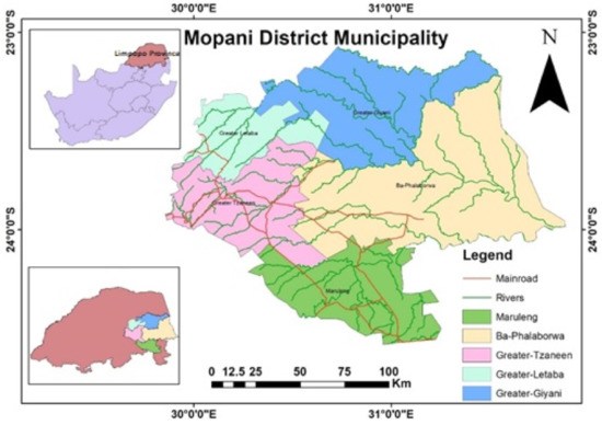 This study was conducted across communities in Mopani District Municipality, which lies in South Africa’s northern Limpopo Province. The district has a total population of 1,092,507 and 296,320 households [16]. It is comprised of five local municipalities: Greater Letaba; Greater-Tzaneen; Greater-Giyani; Ba-Phalaborwa and Maruleng Local Municipality as shown in Figure 1. The decision to focus on all five local municipalities was guided by the climatic conditions across the district. It is a subtropical region with warm temperatures all year round [6], receiving an aerial average of 500 mm annual rainfall during the austral summer between October and March. The greater portion of Mopani District Municipality is made up of rural communities under subsistence livelihood.
