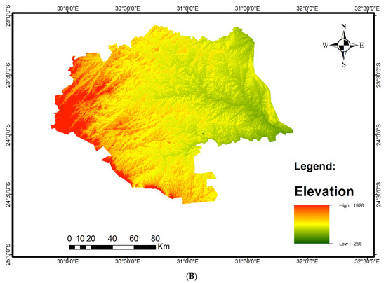 Mopani District Municipality experiences spatially distinct climatic conditions which are also influenced by the extensive topographic variation (Figure 2B). The mean altitude of the eastern lowveld is about 436 m whilst that of the western bushveld averages 811 m above mean sea level separated by the north-eastern escarpment. On the western end the highest elevation is higher than 1800 m falling to below 400 m in the river valleys of the eastern end (Figure 2B). Thus, the land uses and land cover types in the region are influenced by climatic conditions, topography, soil type and accessibility. There are also patches of bare soil and water bodies across the district, and some of the major dams in the district include Nsami Dam, Dap Naude Dam, Middle Letaba Dam and Tzaneen Dam.