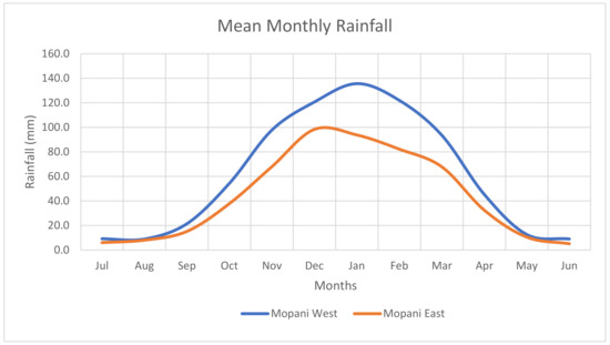 The western bushveld (Mopani West) of the district receives more rainfall as compared to the drier eastern lowveld (Mopani East) as shown in Figure 3. January is the wettest month in the western bushveld receiving a mean monthly rainfall of 136 mm whereas December is the wettest on the eastern lowveld, but with a lower mean of 98 mm/month. Summer rainfall in the district is mainly produced from cloud bands, but sometimes tropical cyclones from the southwest Indian Ocean affect the eastern lowveld. The dry season prevails from April to September with June and August being the driest months such that little or no rainfall occurs during this time. The west-east spatial variability shows distinct gradients mainly due to the presence of a sharp escarpment thus dividing the western bushveld from the eastern lowveld of the district.