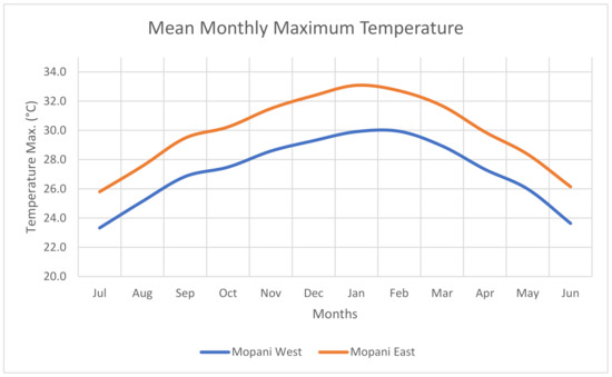 The mean maximum temperature for Mopani District Municipality also depicts temporal and spatial differences largely due to topographic factors. Being on low altitude, the Mopani eastern lowveld is warmer with mean monthly maximum temperature of 33.1 °C experienced during January whilst the western bushveld is slightly cooler with average maximum temperature of 29.9 °C between January and February months (Figure 4). The highest temperatures are experienced throughout the summer months which are expected to be hot in subtropical semi-arid regions. Ref. [6] also found that the lowveld of Mopani District Municipality normally experiences higher summer temperatures all year-round, compared to the interior plateau of South Africa. There exists a non-linear relationship between temperature and rainfall which suggests a decrease in rainfall with increasing air temperature. Ref. [32] have projected future increases in surface air temperatures of 3 to 4 °C over the northeast of South Africa, including reduced rainfall, more frequent drought and increased fire risk over the region. The high temperatures prevailing or projected in the eastern lowveld imply high rates of actual evaporation of water from open water bodies and exposed soils, making rain-fed agriculture untenable.
