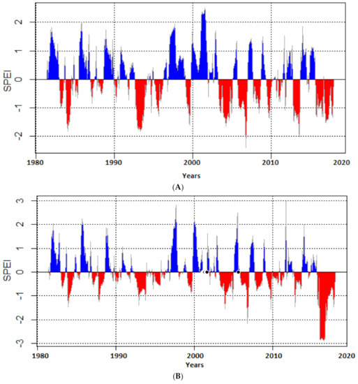 SPEI 3 reflects moisture deficits over a 3-month time scale, representing mid-season moisture conditions [27]. The 3-month time scale is suitable for monitoring soil moisture or rainfall conditions during the growing season [27]. The dry period is much dominant in the first half of the study duration. However, for drought classification and frequency determination, SPEI 6 was used for its suitability to describe a rainy season in southern Africa [27]. Figure 5A,B shows SPEI 6 for western bushveld and eastern lowveld respectively with significant fluctuation from wet to dry season, but dry events are more dominant. The SPEI 6 time scale ranges between October and March (rainy season), and April to September (dry season) from 1980–2016. The notable drought events were in 1980/81, 1982/83, 1983/84, 1986/87, 1991/92, 1993/94, 1997/98, 2002/03, 2004/05, 2007/08, 2011/12, 2014/15 and 2015/16 (Table 6). The early part of the study period from 1980–1995 was characterized by declining rainfall largely due to frequent droughts in the 1980s and the early 1990s [5].