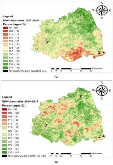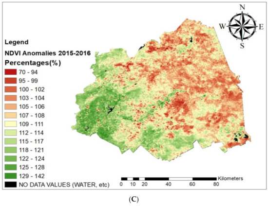 NDVI anomalies across Mopani District Municipality for the austral summer seasons of (A) 2007–2008; (B) 2014–2015; (C) 2015–2016.