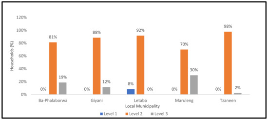The HVI was used to measure vulnerability levels across Mopani District Municipality through the five sustainable livelihood indicators (financial assets, physical assets, social assets, human resource and natural assets). The threshold used was 0–10 for coping level (Level 1) households (CLH) of low vulnerability, 11–20 for acute level (Level 2) households (ALH) with moderate vulnerability and 21–30 for emergency level (Level 3) households (ELH) with high vulnerability (Figure 7).