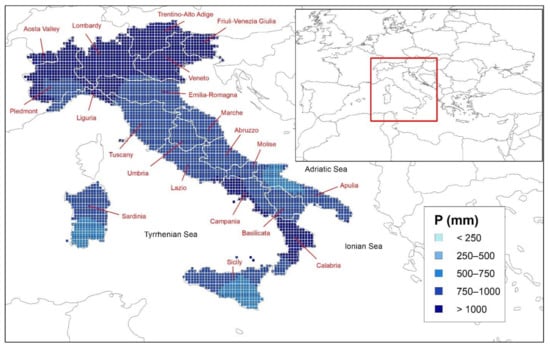With the aim to provide an accurate and reliable estimation of the global precipitation using both active and passive microwave sensors, in 2014 NASA and JAXA launched the successor of the TRMM satellite i.e., the GPM mission [31]. GPM provides four levels of products based on different algorithms. The GPM level 3 products are the IMERG ones, which are characterized by high spatial (0.1° × 0.1°) and temporal (30 min) resolution over the globe. IMERG provides three types of products: near-real-time Early Run (IMERG-E, with a latency of 4 h); reprocessed near-real-time Late Run (IMERG-L, with a latency of 14 h); gauged-adjusted Final Run (IMERG-F, with a latency of 3.5 months), which usually provides more precise precipitation datasets if compared to the previous two products [31]. Data used for this study were the monthly GPM IMERG Final Precipitation L3, Version 06B, provided on a 0.1° × 0.1° (roughly 10 × 10 km) grid over the globe (https://disc.gsfc.nasa.gov/datasets/GPM_3IMERGM_06/summary?keywords=%22IMERG%20final%22). The current period of record runs from June 2000 to the present, with the latest data available for November 2020, as of March 2021. In this paper, a 20-year time frame starting from December 2000 and running until November 2020 has been selected. Figure 1 shows the mean annual rainfall evaluated in the observation period for the 3325 grid points falling within the Italian territory.