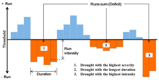 The run theory proposed by Yevjevich [38] can be considered one of the most effective methods in the analysis of time series. The run theory refers to the occurrence of similar events, such as droughts, and allows characterizing each event by assessing some characteristics such as duration, severity, and intensity. An example of the run theory for a specified threshold level is shown in Figure 2 [39].