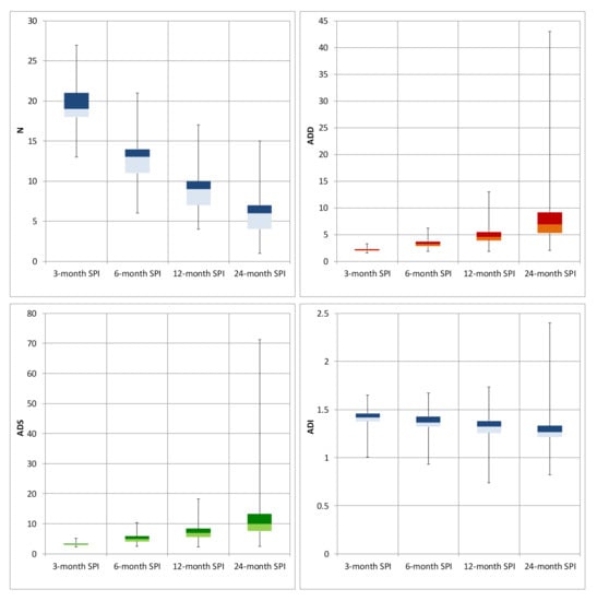 Characterization through boxplots of the number of drought events (N), average drought duration (ADD), average drought severity (ADS), and average drought intensity (ADI). The top and the bottom of the boxes are the third and the second quartiles, respectively; the band inside the box is the median and the ends of the whiskers represent the minimum and maximum of all of the data.