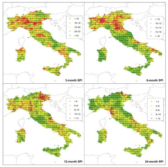 Figure 4 shows the spatial distribution of N. For the 3-month SPI the highest N values (also higher than 25) are localized in some parts of northern Italy (mainly in the Lombardy and the Piedmont regions), in a few areas of central Italy, and in a few regions of southern Italy (Campania, Sicily, and Sardinia). As regards the 6-month SPI, the highest N values are concentrated in northern Italy, reaching values higher than 20, and in a few areas of the Adriatic side of the Peninsula.